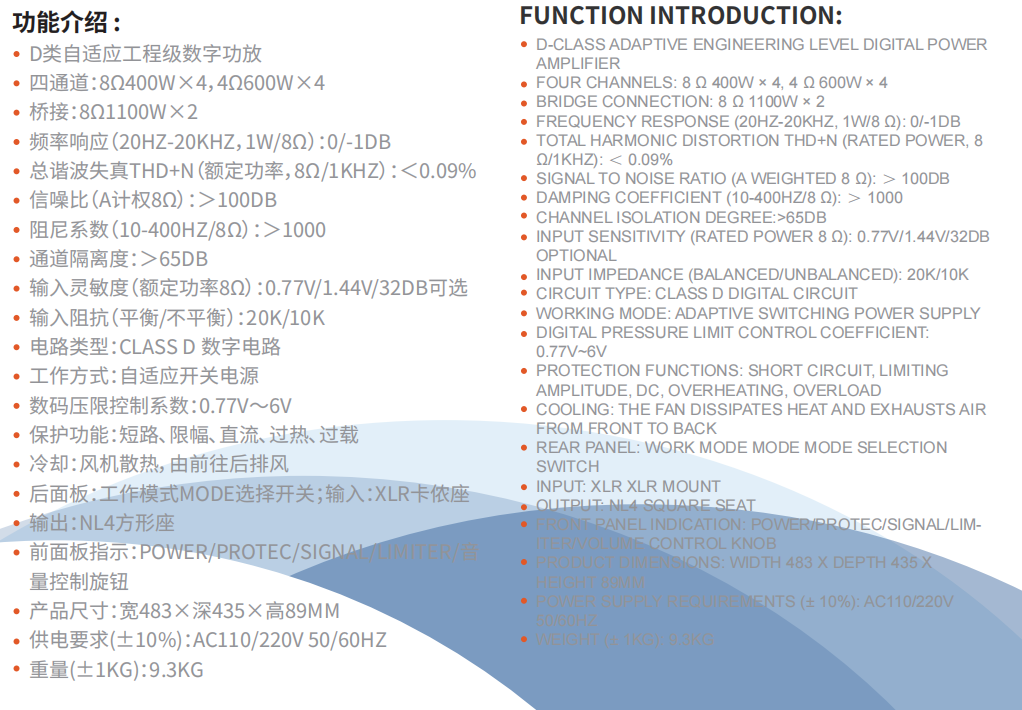 四通道:8Ω400W×4,4Ω600W×4
