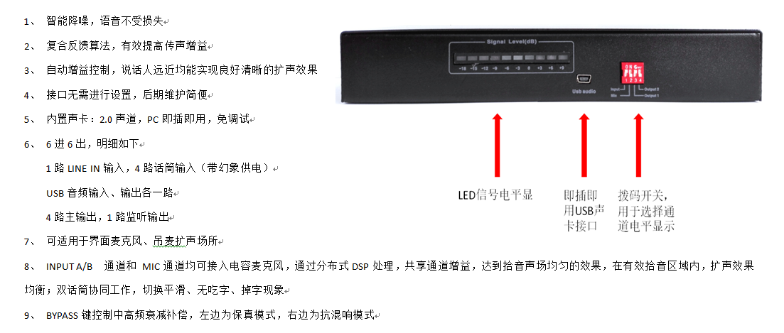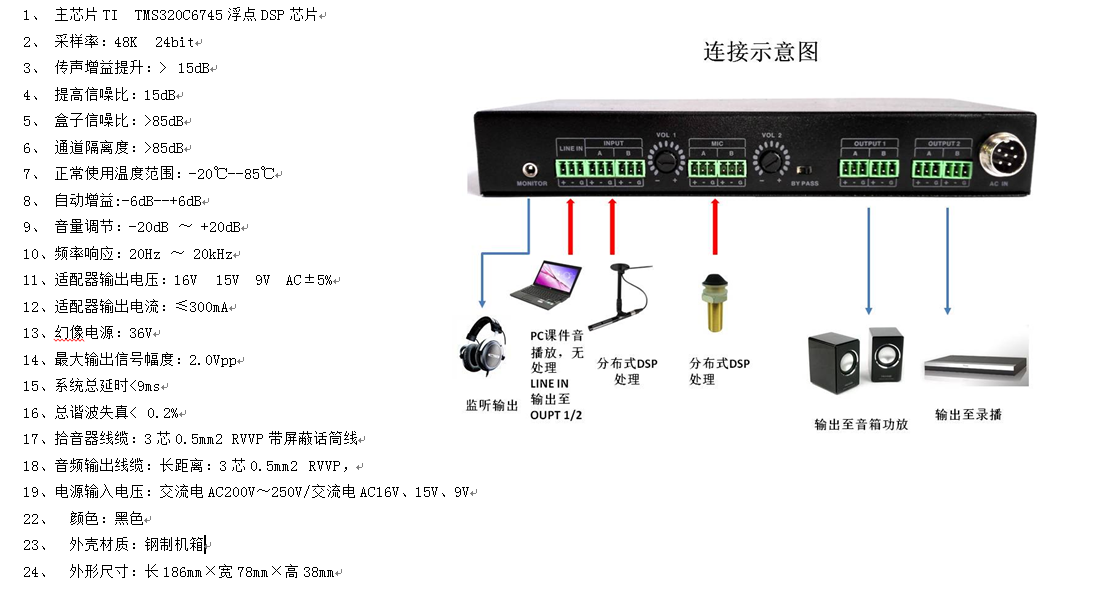 該盒子是應用于嘯叫抑制會議專用產(chǎn)品,采用復合反饋算法,傳聲增益提升高達15dB。采用該產(chǎn)品可應用于教育、庭審等場所,其主要功能包括: